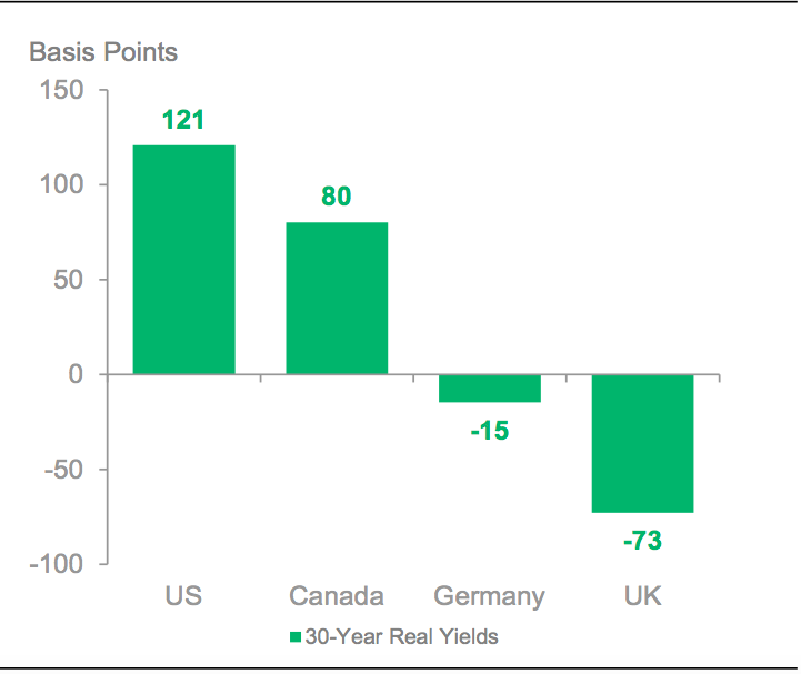 Bemerkenswert ist in diesem Zusammenhang, dass die inflationsgeschützten US-Staatsanleihen (d.h. TIPS) mit 30 Jahren Laufzeit im Vergleich zu anderen Staatsanleihen in z.B. EUR und GBP relativ günstig erscheinen.