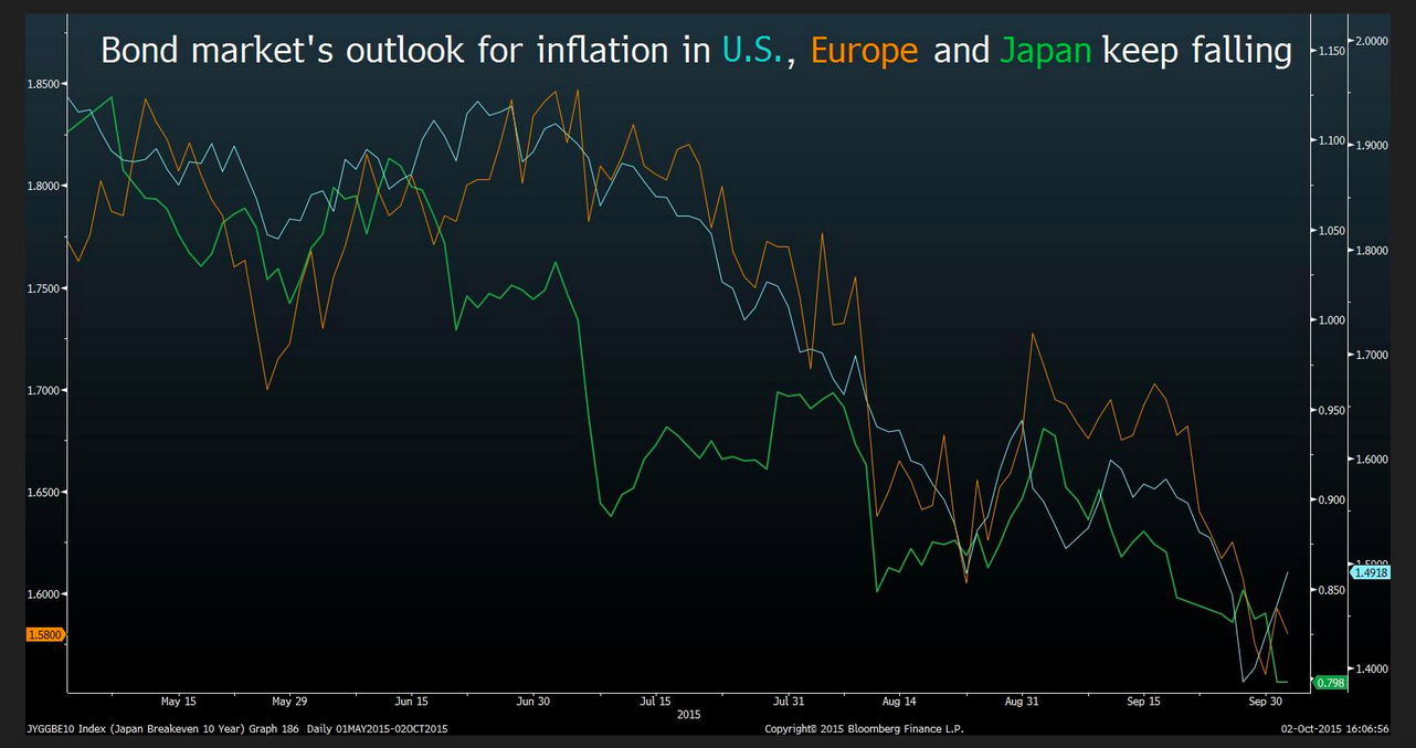 Ben Bernanke zieht in einem lesenswerten Meinungsartikel (“How the Fed Saved the Economy”) in WSJ eine konsequente Resümee mit Seitenhieb, wie die US-Notenbank die Wirtschaft gerettet hat. Die Fed hat ihren Job gemacht: Vollbeschäftigung ohne Inflation ist in Sicht. Was ist aber mit allen anderen?, so der ehemalige Fed-Präsident. Es ist lehrreich, die jüngste Entwicklung der US-Wirtschaft mit der von Europa zu vergleichen, einer grossen Industriewirtschaft von ähnlicher Grösse: Es gibt viele Unterschiede zwischen den USA und Europa. Aber ein kritischer Punkt ist, dass Europas wirtschaftliche Orthodoxie bis vor kurzem weitgehend den Einsatz von Geld- und Fiskalpolitik verhindert hat, um die Erholung der Wirtschaft zu unterstützen, erklärt Bernanke, ohne mit der Wimper zu zucken. Wirtschaftsphilosophie, nicht Machbarkeit ist die Einschränkung: Griechenlands Optionen mögen limitiert sein. Aber Deutschland zum Beispiel hat Möglichkeiten. Und die EZB hat eine breitere geldpolitische Macht als die Fed, betont Bernanke weiter. Inflation-Ausblick im Anleihemarkt im Rückgang, Graph: Bloomberg Europas Versäumnis, nach der Finanzkrise aggressiv Geld- und Fiskalpolitik zu verwenden, ist ein wichtiger Grund, dass Europas Output heute rund 0,8% unter dem Vorkrisenniveau Höchstpunkt liegt.
