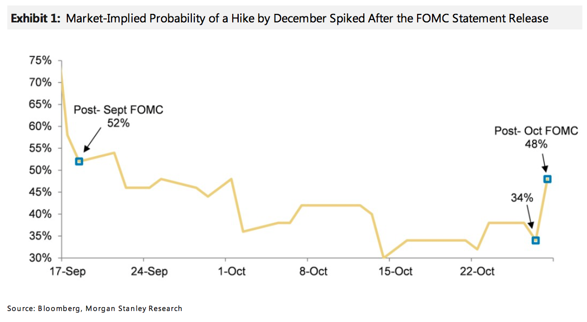 Nach der Bekanntgabe des Zinsentscheides der Fed am Mittwoch hat sich die vom Markt implizierte Wahrscheinlichkeit für eine Zinserhöhung im Dezember von 34% auf 48% hochgeschnellt.