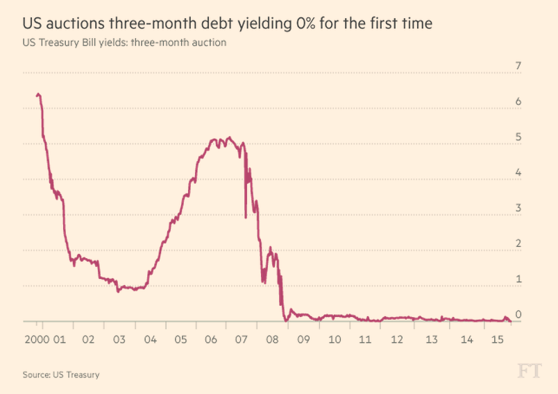 Das US-Schatzamt (US-Treasury) hat am Montag zum ersten Mal auf einer Versteigerung ein Staatspapier mit 3 Monaten Laufzeit zu null Zinsen verkauft. Bei einem Emissionsvolumen von insgesamt 21 Milliarden USD wurden für Gebote von 4,14 USD lediglich 1 USD zugeteilt. Im amerikanischen Sekundärmarkt notieren manche Papiere bereits mit Null- oder sogar Negativ-Renditen. Heute wurden Papiere mit vier Wochen Laufzeit zu minus 0,03% und Papiere mit 3 Monaten Laufzeit zu minus 0,01% gehandelt. Renditen bei UST Auktionen von Papieren mit 3 Monaten Laufzeit, Graph: FT In Europa wurden in diesem Jahr Negativrenditen in Finnland, Deutschland, Frankreich, der Schweiz und Japan verbucht. In allen diesen Ländern werfen Staatspapiere mit 5 Jahren heute eine negative Rendite ab. US-Staatspapiere mit 3 Monaten Laufzeit und die Renditen, die sich bei Versteigerungen ergaben, Graph: WSJ Die Schweizwar das erste Land unter fortgeschrittenen Volkswirtschaften, die im April eine 10-jährige Staatsanleihe mit Negativrendite auf einer Versteigerung verkauft hat.