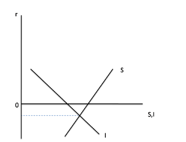S: Ersparnisse, I: Investitionen, mit neg. Gleichgewichtszinssatz (r), Graph: Mark Thoma in: CSB money watch