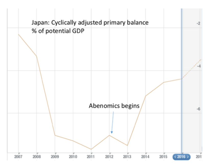 Der am Graduierten Zentrum der City University New York (CUNY) forschende Wirtschaftsprofessor zeigt anhand des strukturellen Primärsaldos (eine grobe Messung des Nachfrage-Effekts der Fiskalpolitik) Japans (Daten: Schätzung von IWF), dass die Fiskalpolitik seit Abenomics nicht lockerer, sondern ganz im Gegenteil restriktiver geworden ist. Dass heisst, dass die expansive Geldpolitik von der Fiskalpolitik nicht gestützt wurde.