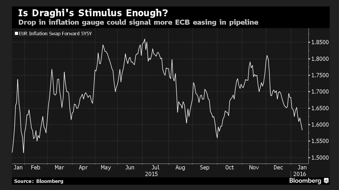 Die EZB bemüht sich mit den im Juni 2014 ergriffenen geldpolitischen Massnahmen dazu beizutragen, dem „Prozess der Entankerung der Inflationserwartungen Einhalt zu gebieten“.Die 5-jährigen inflationsindexierten Termin-Sätze in den nächsten 5 Jahren (*) sind am Freitag nach Angaben von Bloombergauf 1,58% gefallen. Das ist der tiefste Wert seit Oktober 2015.Während der anhaltende Rückgang der Rohstoffpreise (siehe: Ölpreisentwicklung) und die Abwertung der chinesischen Währung einen disinflationären Druck auf die Weltwirtschaft auslösen, verschlechtern sich die Aussichten für das Wachstumsszenario im Euro-Raum.Vor dem Hintergrund der niedrigen Inflationsdaten vom Dezember (0,2%) richtet sich der Blick nun auf das Treffen des EZB-Rates am Donnerstag, den 21. Januar.Aus der am Donnerstag veröffentlichten Zusammenfassung der geldpolitischen Sitzung („Accounts“) des EZB-Rates geht hervor, dass die Ratsmitglieder eine Rekalibrierung des akkommodierenden geldpolitischen Kurses der EZB für notwendig halten, um eine Rückkehr der Inflationsraten auf ein Niveau von rund 2% zu gewährleisten.Die 5-jährigen inflationsindexierten Termin-Sätze in 5 Jahren (5y5y inflation forward swap rates), Graph: Bloomberg (*) Die von Mario Draghi damals hervorgehobene Messgrösse für Inflationserwartungen im Euroraum.