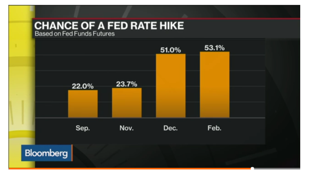 Fed Funds Futures implizieren eine 50%-ige Chance für eine Zinserhöhung bis zum Jahresende, wie Bloomberg gestützt auf die eigenen Daten berichtet. Im Vergleich lag die Chance vor einer Woche bei 42%.