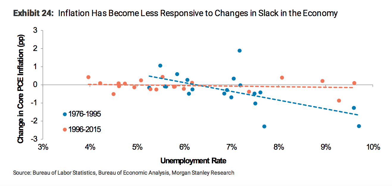 Wie die folgende aufschlussreiche Abbildung von Morgan Stanley nahelegt, scheint aber die Inflation weniger empfänglich auf die Veränderungen der wirtschaftlichen Flaute. Denn die Phillips Kurve verläuft ganz flach, d.h. horizontal, nicht vertikal.