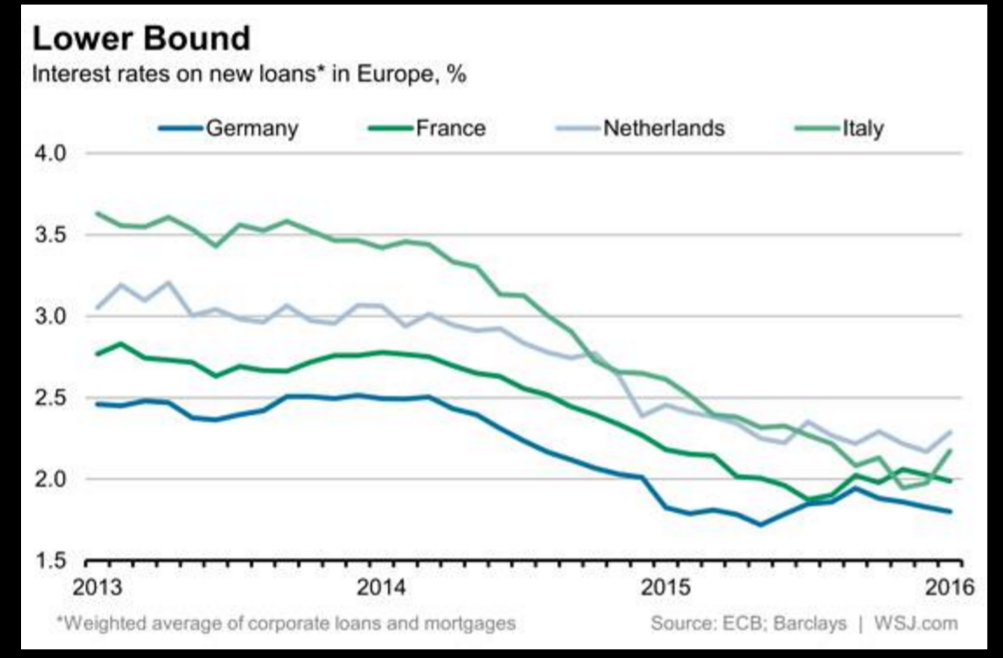 Zinssätze für neue Kreditvergabe im Euro-Raum, Graph: WSJ
