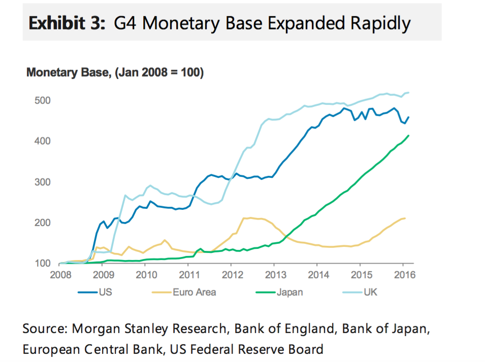 Der starke Anstieg der Notenbankgeldmenge (monetary base) in G4-Ländern, Graph: Morgan Stanley