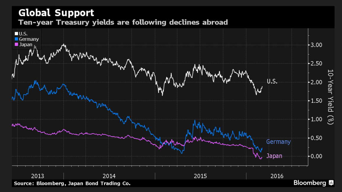 Rendite der Staatsanleihen mit 10 Jahren Laufzeit im Vergleich; USD: 1,86%, EUR: 0,23% , JPY: -0,03%, CHF: -0,38%, Graph: Bloomberg