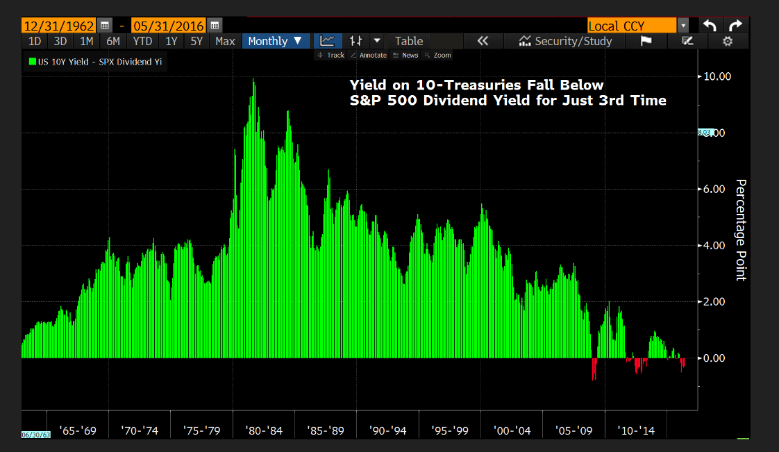 US-Treasury Bonds scheinen seit 5 Monaten teurer als die US-Aktien gemessen am relativen Wert; Rendite der 10-jährigen Staatsanleihen: 1,62%, Dividenden-Rendite der Aktien im S&P-500 Index: 2,17%, Graph: Bloomberg