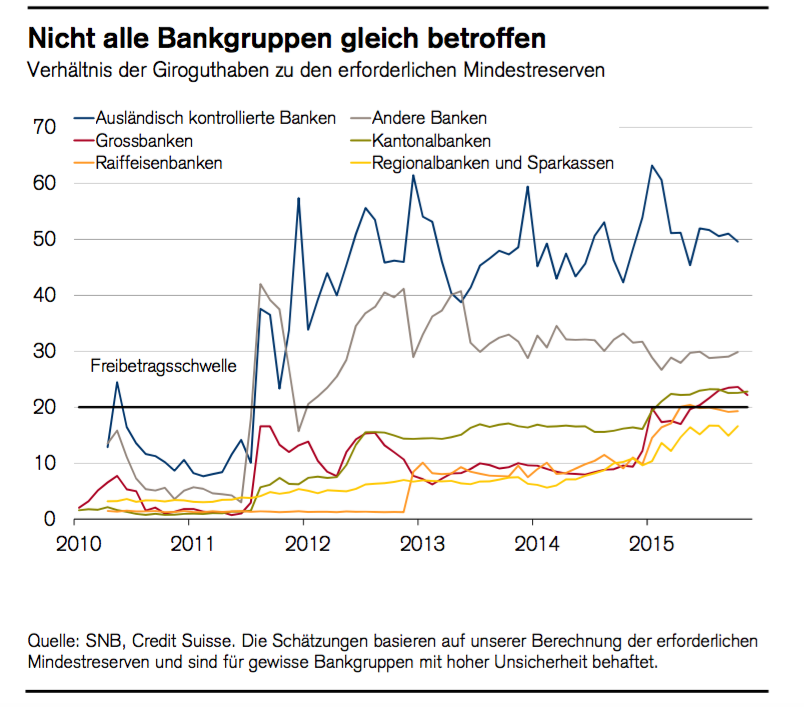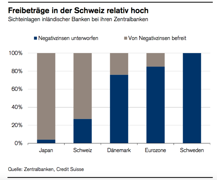 Die SNB hat im Rahmen ihrer unkonventionellen Geldpolitik im Dezember 2014 Negativzinsen eingeführt. Damit werden die CHF-Guthaben (*) der Banken bei der SNB belastet.Die Einlagen stammen hauptsächlich von inländischen Banken, von Versicherungen, dem Bund und ausländischen Banken. Zur Erinnerung: Die Pensionskassen können keine Einlagekonten bei der SNB eröffnen.Die Belastung durch Negativzinsen hängt von dem jeweiligen Geschäftsmodell ab. Für Inlandbanken gelten Freibeträge (in 20-facher Höhe der erforderlichen Mindestreserven). Für Auslandbanken werden individuelle Freibeträge festgelegt. Da ein Institut mit grossem Retailkunden-Geschäft i.d.R. höhere Mindestreserven halten muss, fällt sein Freibetrag höher aus. Credit Suisse hat dazu gestern in einer Analyse folgende sehenswerte Abbildungen geliefert. Nicht alle Banken werden von Negativ-Zinsen gleich betroffen, Graph: Credit Suisse in: „Monitor Schweiz“, März 2016.Die Verfasser der Analyse kommen zum Schluss, dass Banken mit stärkerer Retail-Ausrichtung zurzeit unter oder nur knapp über ihrer Freibetragsschwelle liegen. Das heisst, dass ihnen die Negativzinsen nur relativ geringe Kosten verursachen.Freibeträge von Negativzinsen sind in der Schweiz relativ hoch, Graph: Credit Suisse in: „Monitor Schweiz“, März 2016.Die SNB ist nicht die einzige Zentralbank, die negative Zinsen auf Einlagen der Geschäftsbanken erhebt.