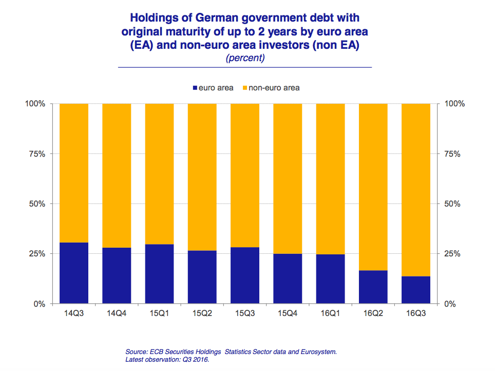 Die EZB-Daten zeigen, dass die ausländischen Investoren mittlerweile 90% der kurzfristigen deutschen Schuldtitel halten. Noch vor zwei Jahren belief sich der Wert auf 70%, zum Startpunkt des Anleihekaufprogramms der EZB am offenen Markt.