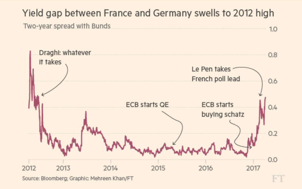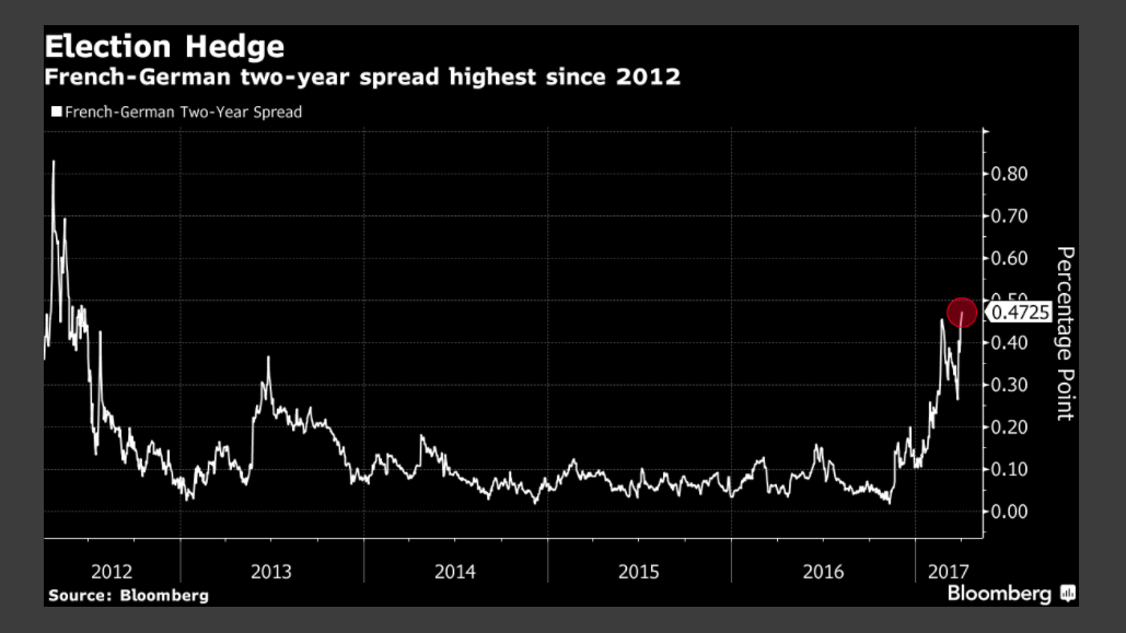 Die Rendite-Differenz ist drei Wochen vor den französischen Präsidentschaftswahlen auf das höchste Niveau (0,4725%) seit der Krise der Eurozone gestiegen.