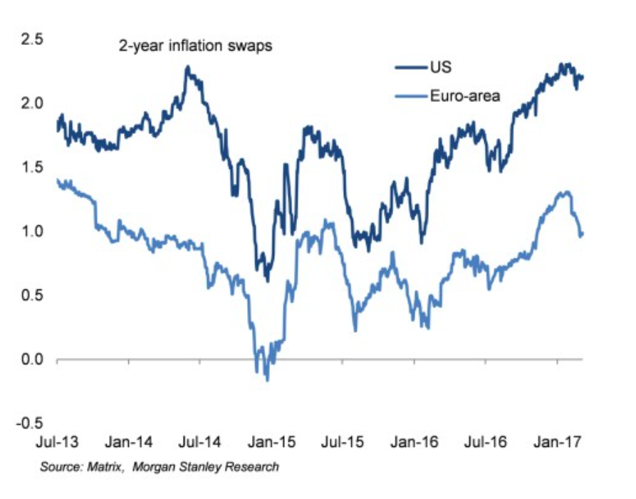 Swapsätze (2 Jahre) für die Inflation im Vergleich USA versus Euroraum, Graph: Morgan Stanley