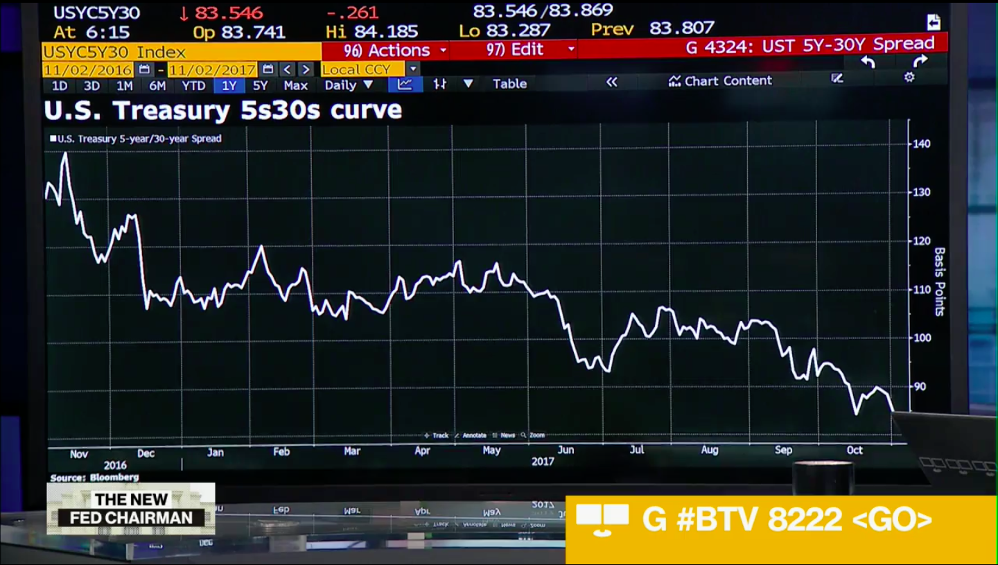 Die flacher werdende US-Renditekurve gemessen am Renditeabstand von 5y30y, Graph: BloombergTV