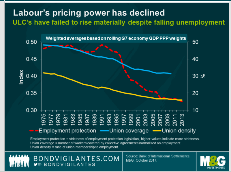 Ein wesentlicher Faktor für die Inflation ist die Entwicklung der Löhne, die wie Bond Vigilantes berichtet. Die Lohnstückkosten in G7 sind trotz des Rückgangs der Arbeitslosenquote nicht gestiegen.