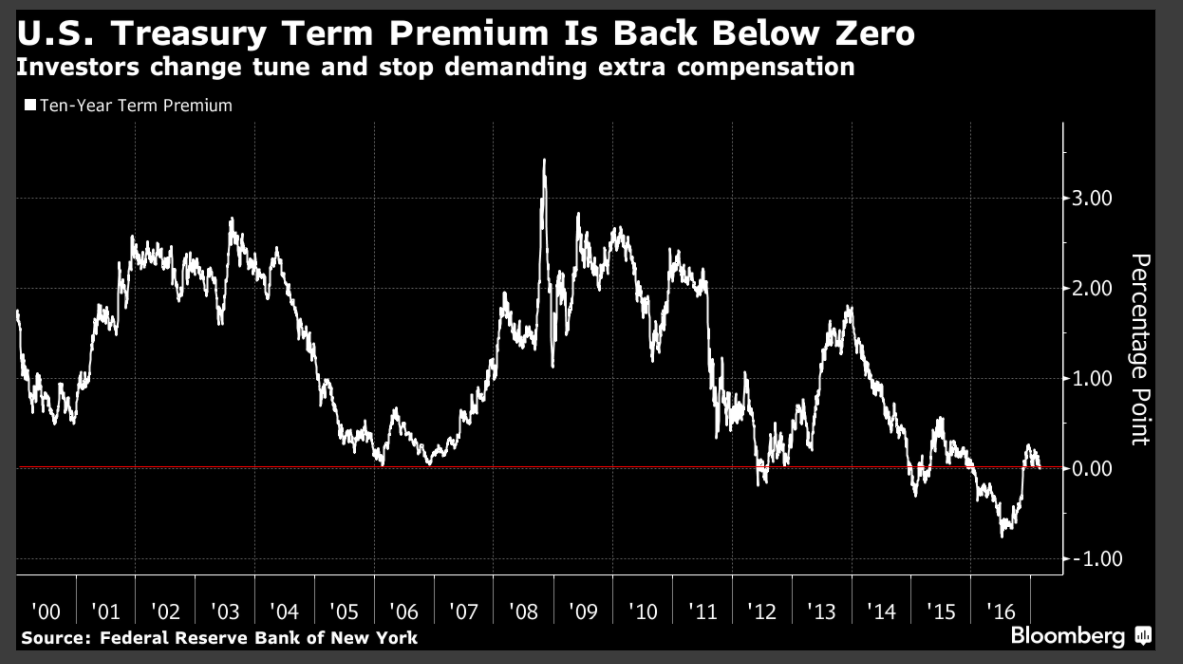 Die Laufzeitprämie (term premium) für US-Treasury Bonds mit 10 Jahren Laufzeit, Graph: Bloomberg