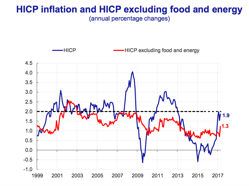 Inflation im Euroraum, Graph: Peter Praet ECB in: Ensuring price stability, May 4, 2017
