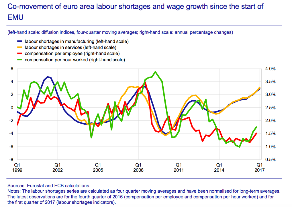 Dass das Unsinn ist und in der Praxis nicht zutrifft, unterstreicht der am Mittwoch publizierte Bericht der ECB (Economic Bulletin Issue 3, 2017), der auf den hohen Anteil der Unterbeschäftigung in Europa hinweist.