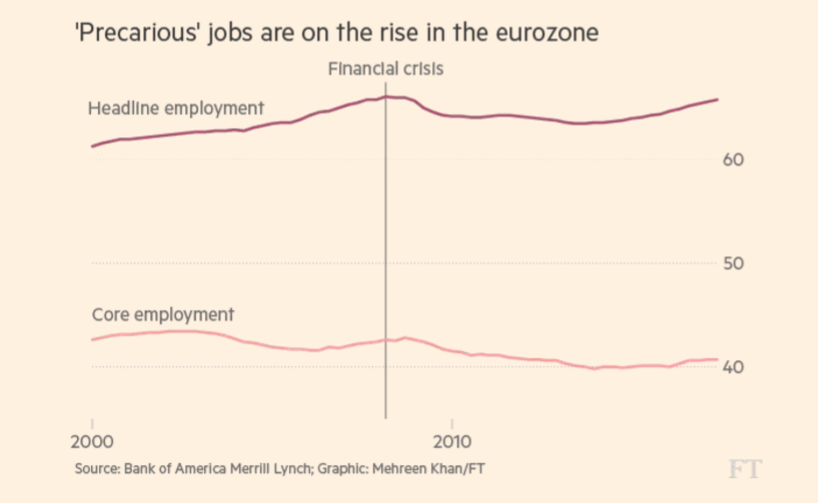 Die Schlussfolgerungen der EZB decken sich u.a. mit der jüngsten Forschungsarbeit der Bank of America Merrill Lynch, wonach die Mehrzahl der Stellen, die in den vergangenen Jahren in Europa geschaffen wurden, von minderer Qualität sind. Es ist traurig, zuzusehen, wie die Kern-Beschäftigung schrumpft.