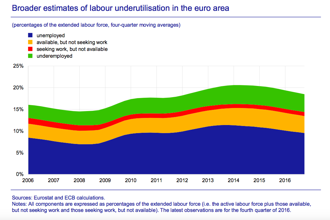 Unterbeschäftigung (Unterauslastung des Faktors Arbeit) im Euroraum, Graph: ECB in Economic Bulletin, May 2017.
