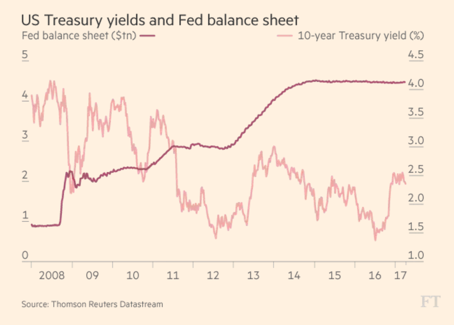 Die Bilanzsumme der Fed und der Verlauf der Rendite der US-Staatsanleihen mit 10 Jahren Laufzeit, Graph: FT