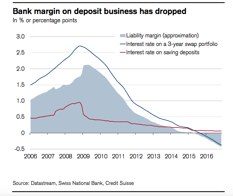 Rückgang der Margen im Einlagengeschäft, Graph: Credit Suisse Research, March 20, 2017.