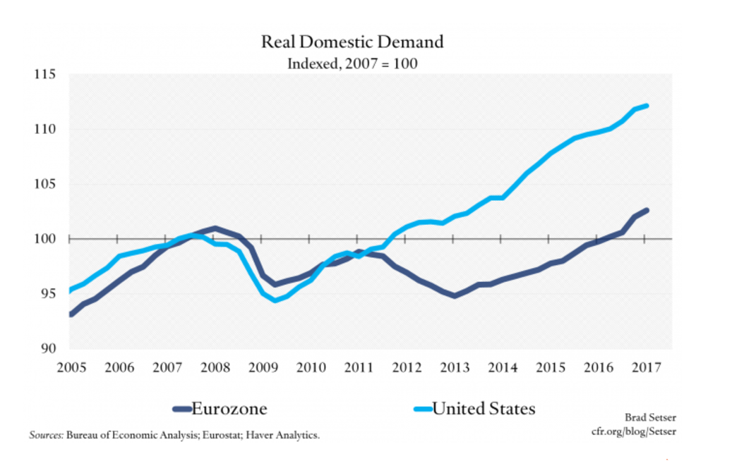 Die reale Binnennachfrage im Vergleich: US-Wirtschaft versus Euroraum, Graph: Brad Setser, August 2017