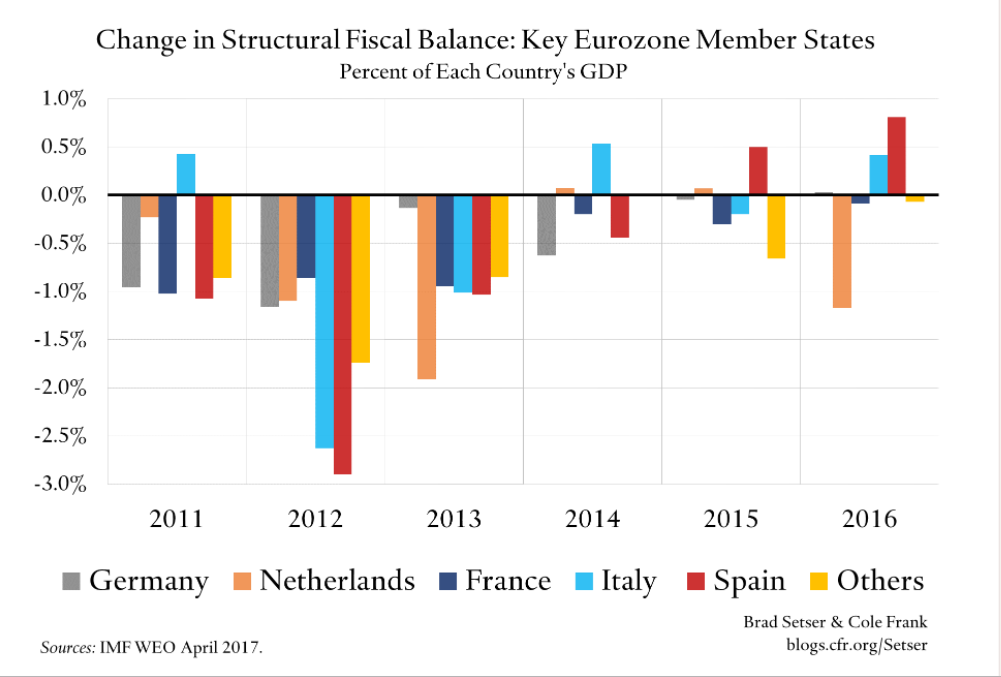 Die makroökonomischen Ungleichgewichte sind zumindest seit dem Ausbruch der globalen Finanzkrise von 2008 offensichtlich und in aller Munde.Was ist zu tun? Soll man Fiskalpolitik (z.B. einen expansiven resp. restriktiven Kurs) einsetzen oder die Handelspolitik (z.B. mit Protektionismus) neugestalten?Der IWF findet, dass die Fiskalpolitik im Gegensatz zur Handelspolitik einen erheblichen Einfluss auf das externe Gleichgewicht hat.Wenn die Überschuss-Länder eine expansive Fiskalpolitik ausführen, stimulieren sie die Nachfrage im Binnenmarkt und steigern ihre Einfuhren. Eine lockere Fiskalpolitik führt i.d.R. zu einer restriktiven Geldpolitik, die wiederum dazu beiträgt, dass die Landeswährung aufwertet.Und wenn die Defizit-Länder eine restriktive Fiskalpolitik verfolgen, reduzieren sie das Nachfragewachstum im Inland und schränken die Einfuhren ein. Unternehmen in Defizit-Ländern beginnen dann, nach Märkten Ausschau zu halten, wo eine expansive Fiskalpolitik eingesetzt wird und Nachfrage vorhanden ist.Veränderungen im strukturellen Haushalt im Ländervergleich, Graph: Brad Setser(*) Basierend auf IWF-Daten tragen Deutschland und die Niederlande am meisten zu der Haushaltskonsolidierung im Euroraum bei, und zwar seit 2014.