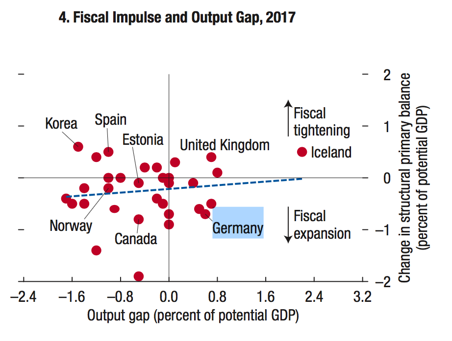 Bemerkenswert ist, dass der IWF davon ausgegangen ist, dass Deutschland eine lockere Fiskalpolitik verfolgen würde. Es kam aber im vergangenen Jahr zu keiner strukturellen fiskalpolitischen Expansion in Deutschland. Die strukturelle Haushaltsbilanz blieb in einem erheblichen Überschuss.