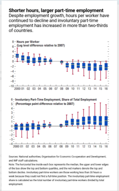 Trotz des Beschäftigungswachstums sind die Stunden pro Arbeitnehmer weiter rückläufig und die unfreiwillige Teilzeitbeschäftigung hat sich in mehr als zwei Drittel der Länder erhöht, Graph: IMF