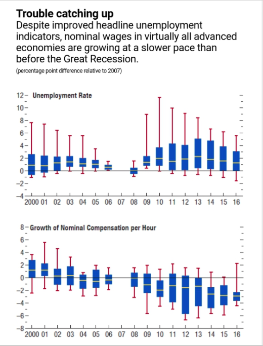 Die Nominallöhne in nahezu allen fortgeschrittenen Volkswirtschaften wachsen mit langsamerem Tempo als vor der Zeit der Great Recession, Graph: IMF