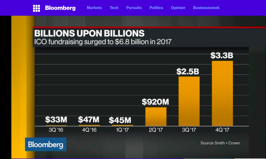 Tokens: Geldbeschaffung via ICO (Initial Coin Offerings) im Jahr 2017: 6,8 Mrd. USD, Graph: BloombergTV, Jan 22, 2018