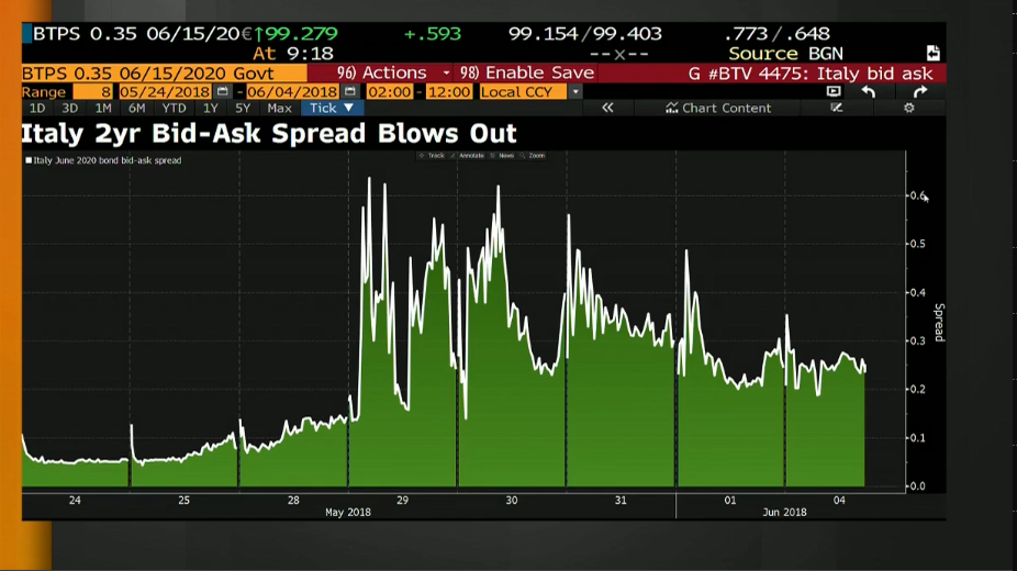 Der Verlauf des Abstands zwischen dem Geldkurs (bid) und dem Briefkurs (ask) von italienischen Anleihen mit 2 Jahren Laufzeit im Tageshandel, Graph: BloombergTV, June 4, 2018
