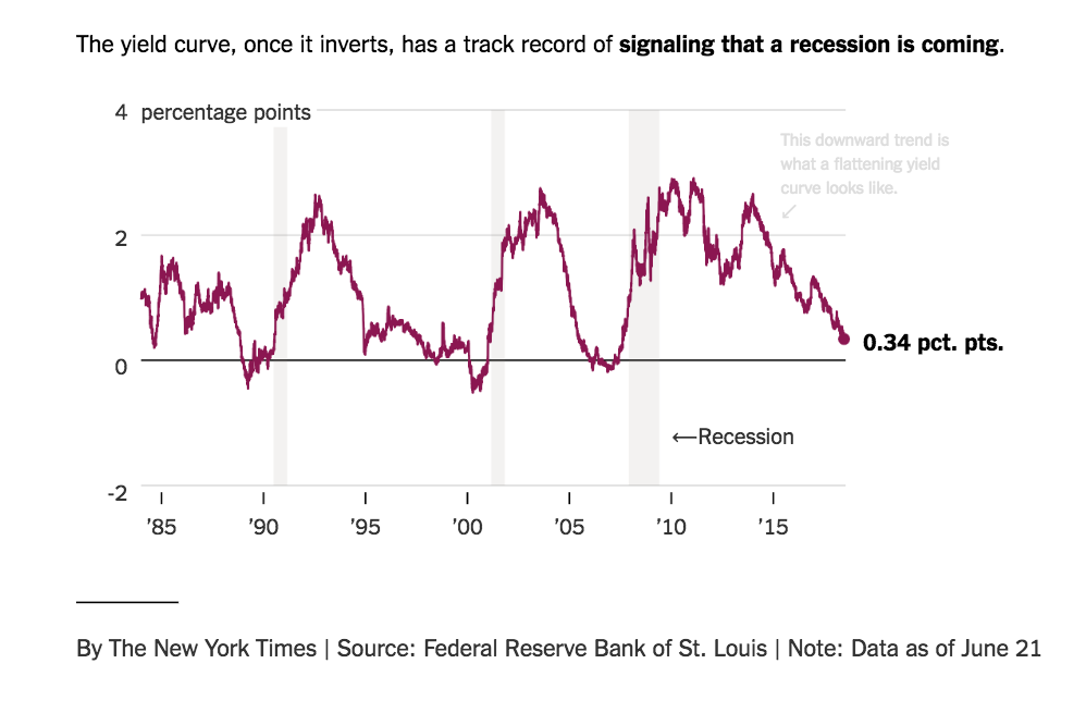 Die Renditekurve hat sich, bevor die Rezession 2017 einschlug, umgekehrt („invertiert“), Graph: NYTimes @nytimes