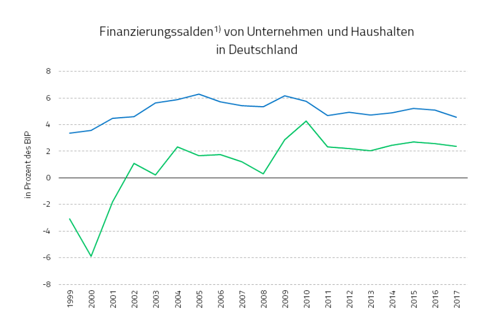 Denn wie wir der folgenden Abbildung entnehmen können, weisen die privaten Haushalte, Unternehmen und die öffentliche Hand in Deutschland jeweils einen Überschuss im Finanzierungssaldo.