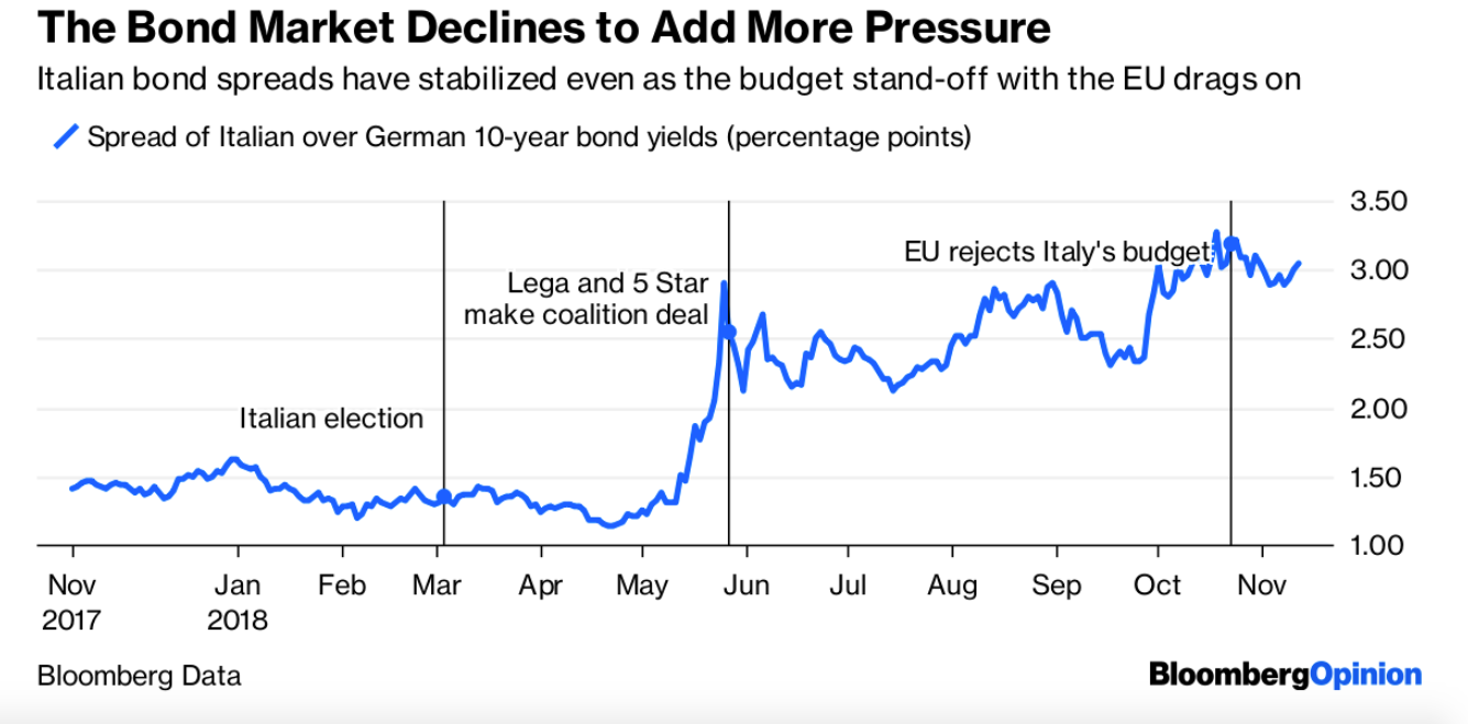 ITA-GER: Der Rendite-Abstand (spread) zwischen Staatsanleihen mit 10 Jahren Laufzeit, Graph: John Authers, Bloomberg, Nov 13, 2018
