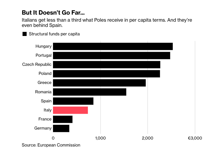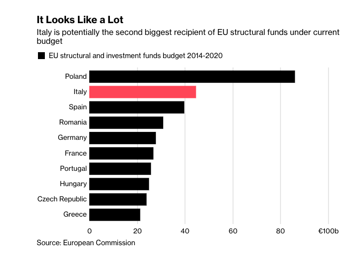 Bloomberg liefert dazu fünf Abbildungen, die zeigen, dass Italien möglicherweise der zweitgrösste Empfänger von EU-Strukturfonds im laufenden Haushalt ist.