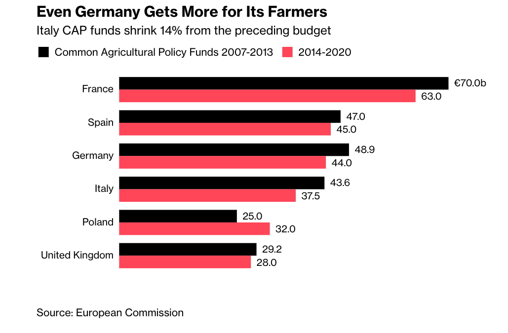 Selbst Deutschland bekommt von der EU für seine Landwirte als Italien, Graph: Bloomberg, June 6, 2018