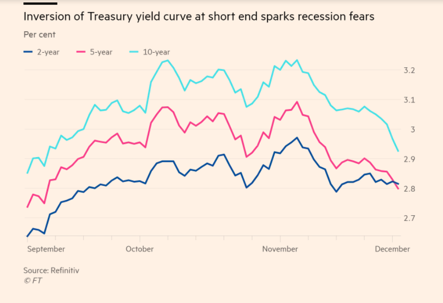 Die Rendite der US-Staatsanleihen mit 2, 5 und 10 Jahren Laufzeit, Graph: FT, Dec 5, 2018