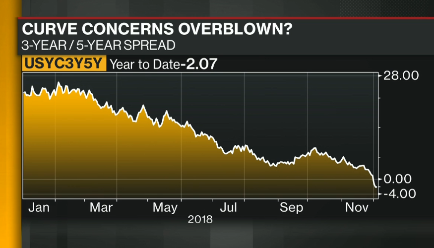 Rendite-Spread für US-Staatsanleihen mit 3 und 5 Jahren Laufzeit, Graph: BloombergTV, Dec 5, 2018
