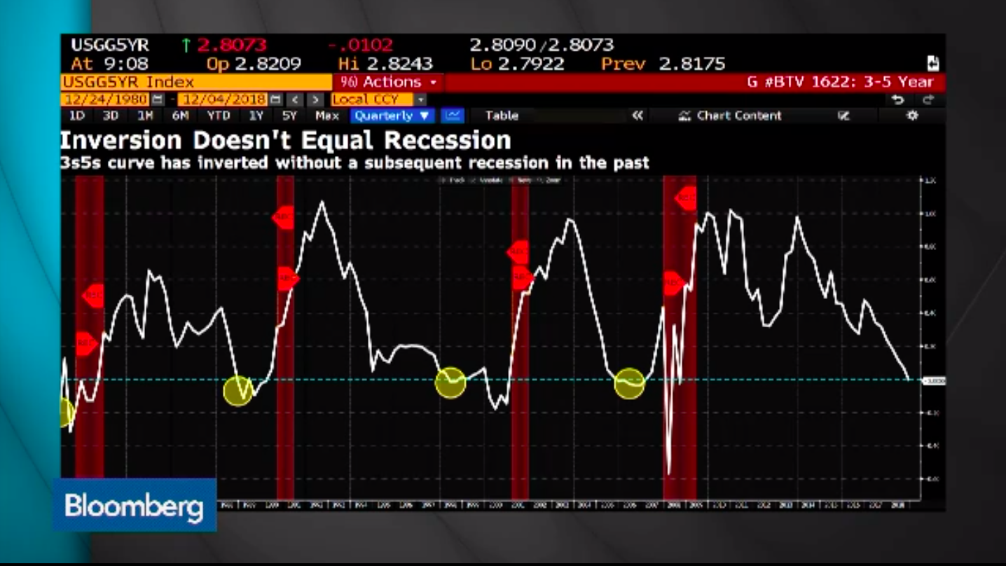 Eine inverse Zinsstruktur-Kurve bedeutet nicht automatisch Rezession, Graph: BloombergTV, Dec 4, 2018