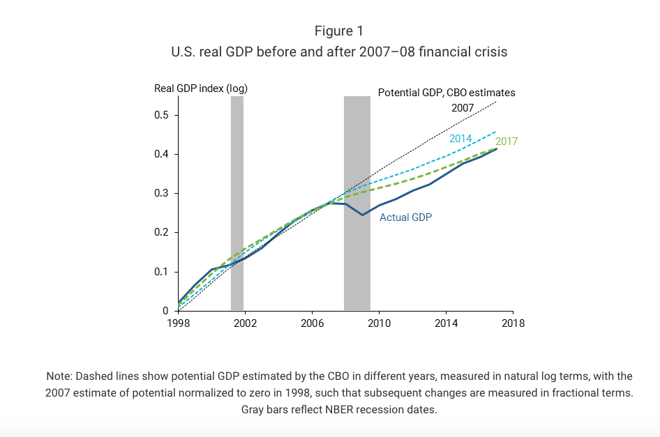 Ein Jahrzehnt nach der letzten Finanzkrise und der Rezession bleibt die US-Wirtschaft nach wie vor deutlich kleiner als es nach dem Wachstumstrend vor der Krise möglich wäre.