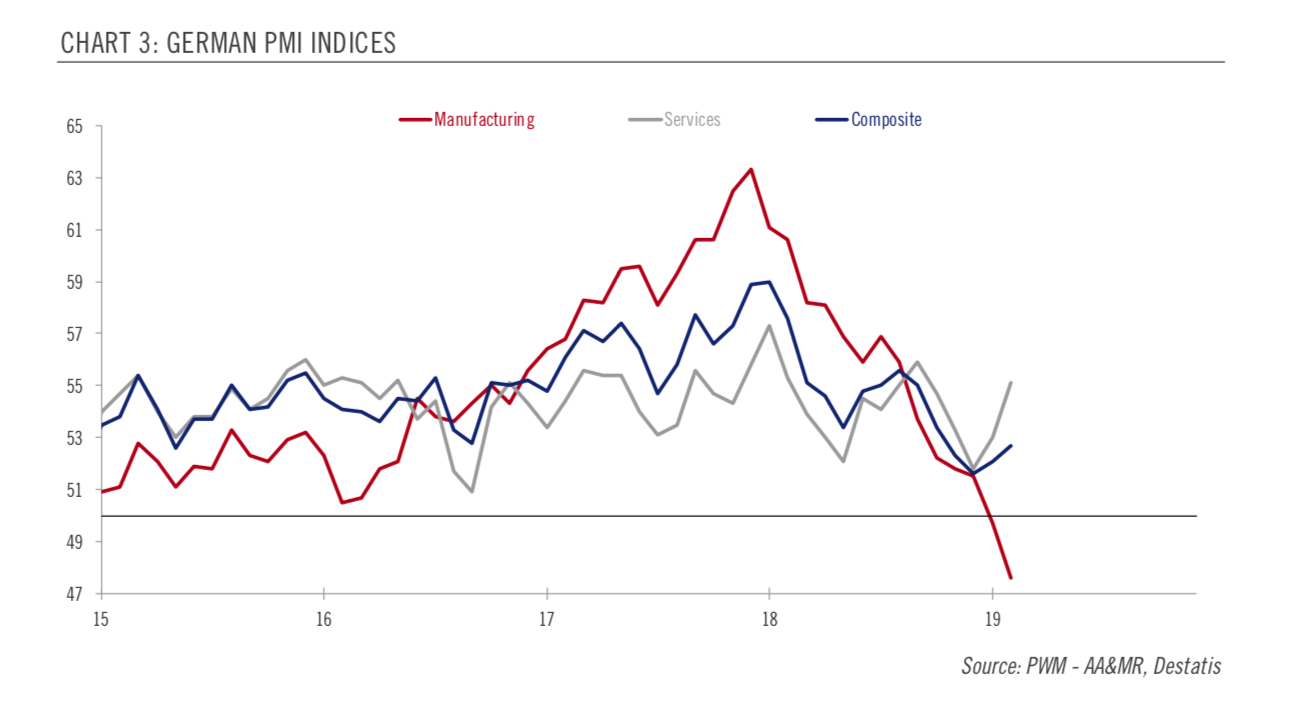 Die konjunkturelle Abkühlung in Deutschland. German PMI Indices, Graph: PictetWM, Febr 25, 2019