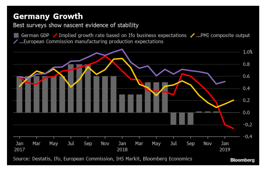 Deutschlands Wirtschaftswachstum mit Abwärtsbewegung, Graph: Bloomberg, Febr 27, 2019