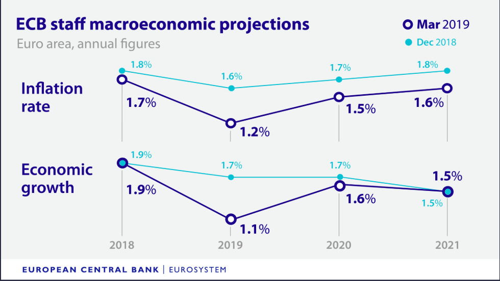 Der schwächste Ausblick für die Eurozone seit 2013. Die Staff-Economic Prognosen der EZB. Bemerkenswert ist, dass die EZB die Inflation-Prognose für 2021 von 1,8% auf 1,6% zurück revidiert hat, Graph: ECB, March 7, 2019