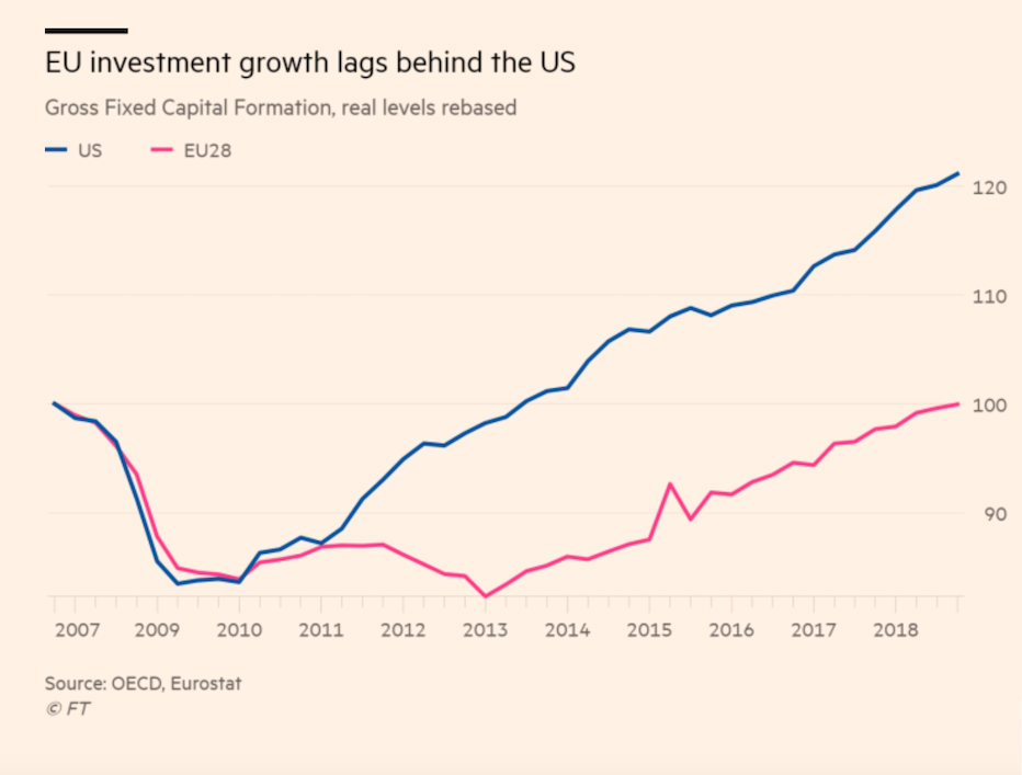 Die Investitionen in der EU sind endlich wieder auf Vorkrisenniveau zurückgekehrt (nach mehr als 11 Jahren). Der Anstieg der Investitionen in der EU blieb jedoch hinter dem Anstieg der Konsumausgaben zurück, Graph: FT, March 9, 2019