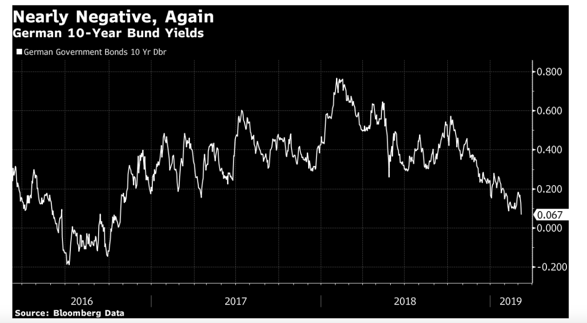 Die Rendite der deutschen Staatsanleihen mit 10 Jahren Laufzeit: 0,05%, Graph: John Authers, Bloomberg Opinion, March 8, 2019