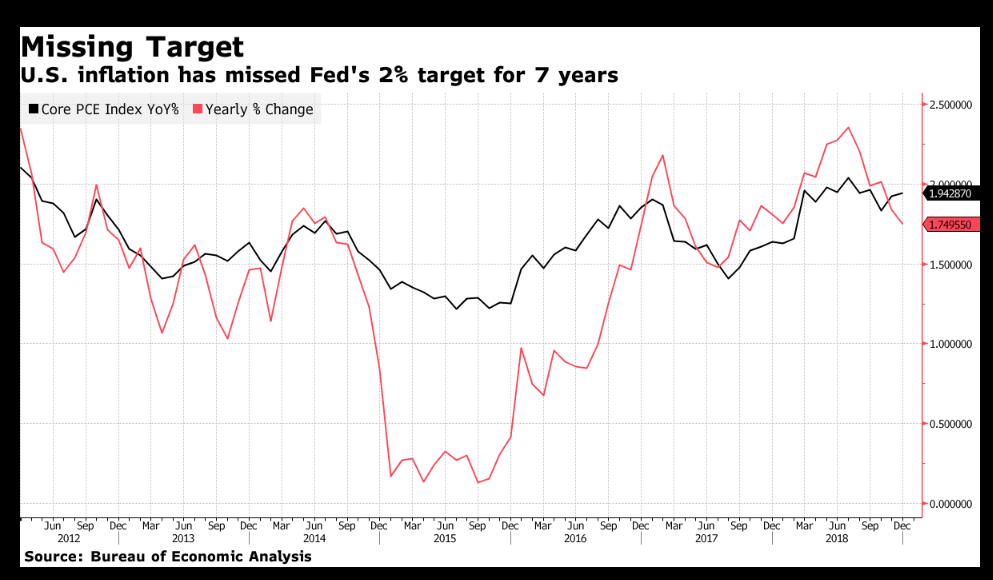 Die US-Notenbank verfehlt unterdessen das eigene Inflationsziel seit sieben Jahren, Graph: Bloomberg, March 8, 2019