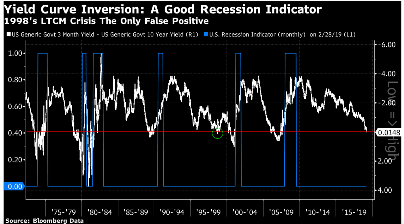 Die inverse US-Zins-Strukturkurve: Die Rendite-Differenz zwischen den UST mit 10 Jahren Laufzeit und T-Bills mit 3 Monaten Laufzeit ist negativ, Graph: Bloomberg TV, March 25 2019
