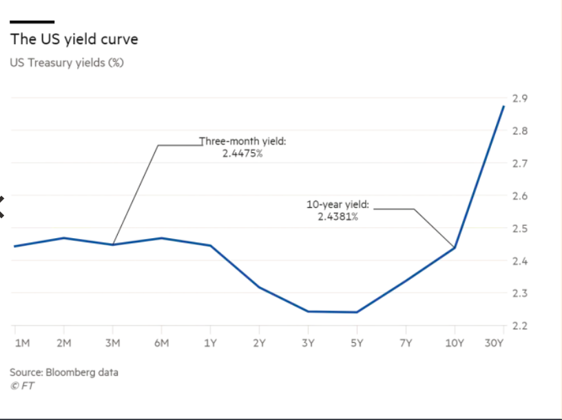 UST Zinsstruktur (yield curve): 3 Monate: 2.4475% versus 10 Jahre 2.4381%, Graph: FT, March 25, 2019